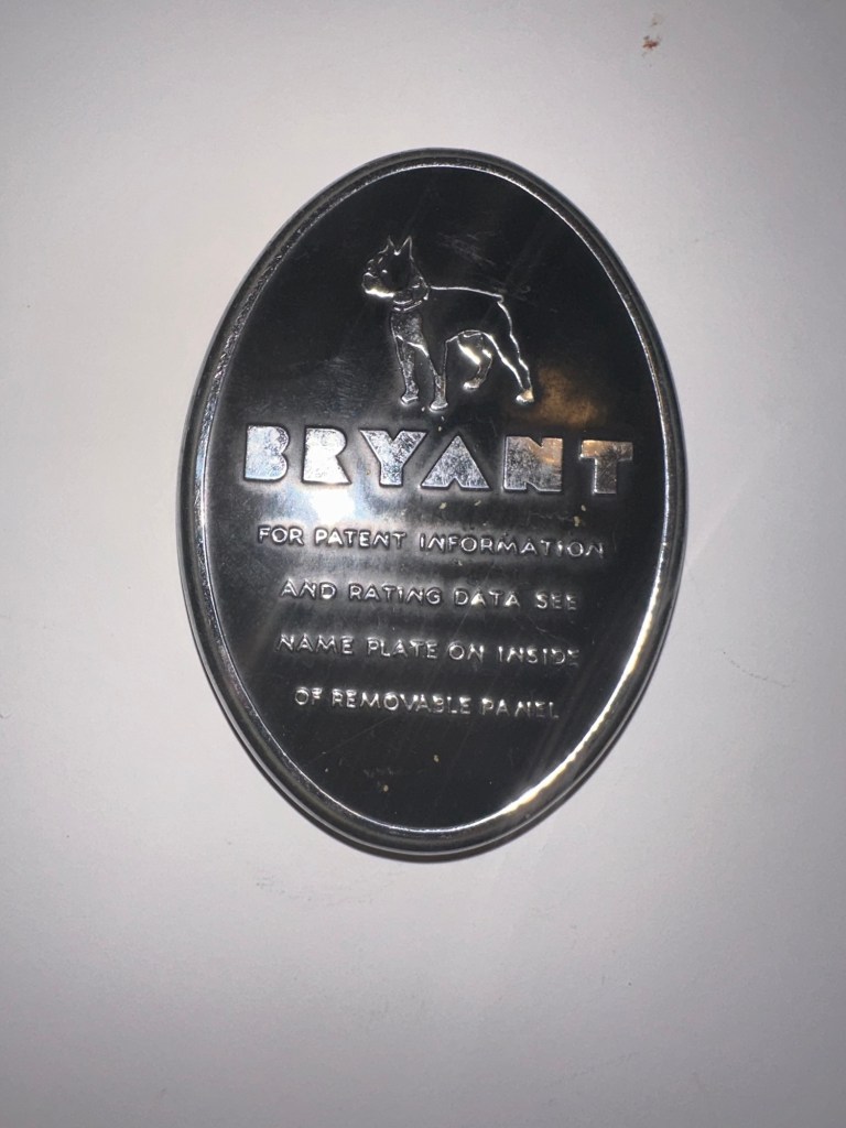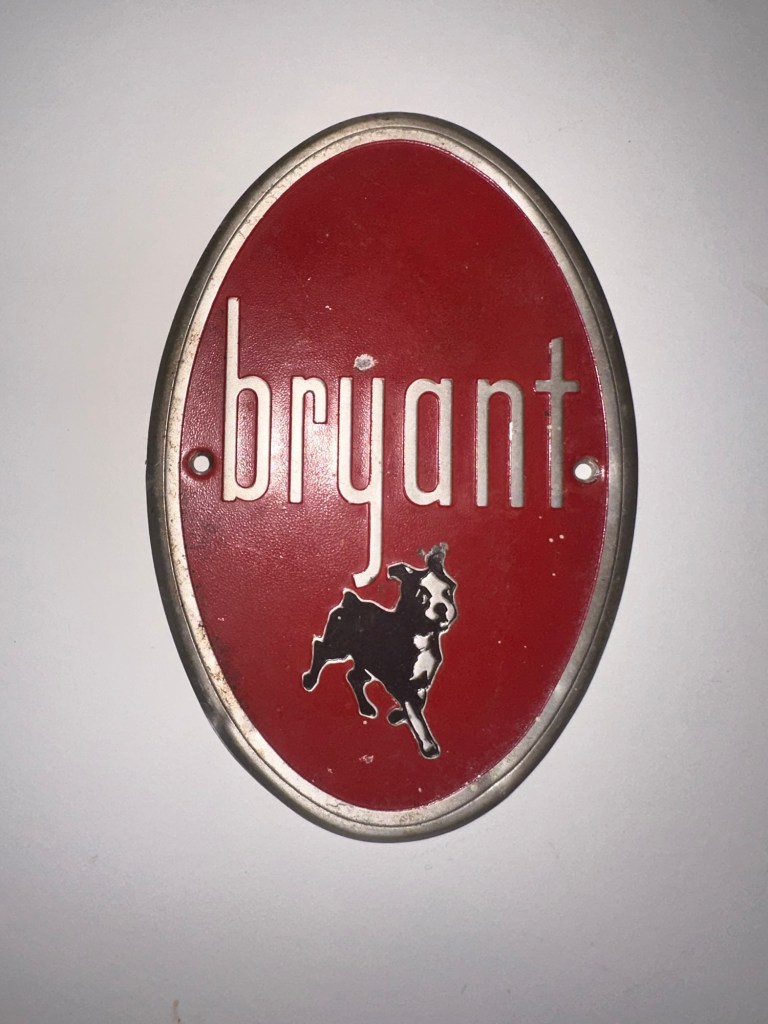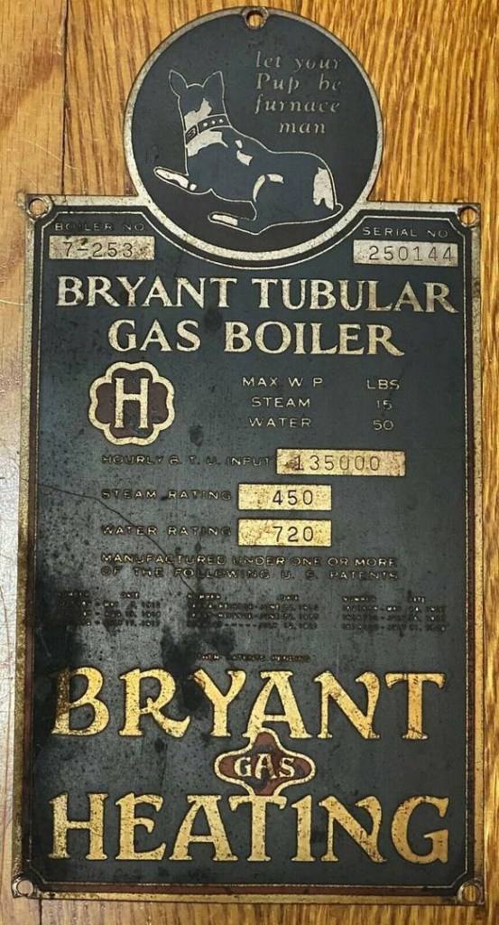 As the years went on, more and more homes turned to Bryant for warmth. By the 1920s and ’30s, Bryant furnaces were becoming a household name. They earned a reputation for solid engineering and dependable performance, which meant a lot during cold winters in the Midwest and beyond. In 1927 and up to the late 50’s, Bryant had developed the iconic “Let The Pup Be Your Furnaceman” slogan featuring a Boston Terrier front and center on their emblems. In (Fig. A) we can see one of their earlier badges which had consisted of a large dataplate found on their furnaces and (Fig. B) showing what the emblem would’ve looked like on their boilers.