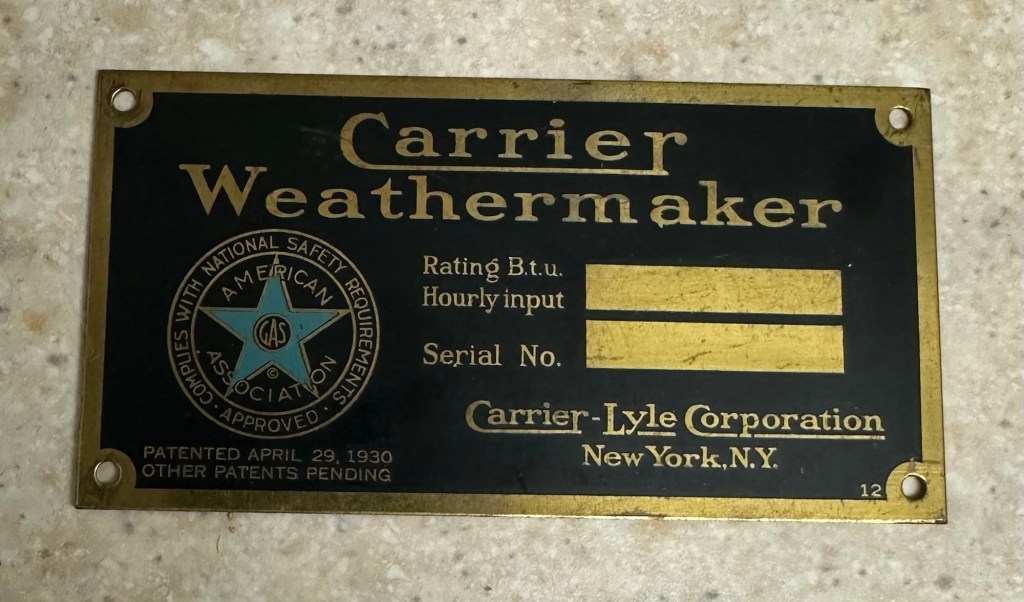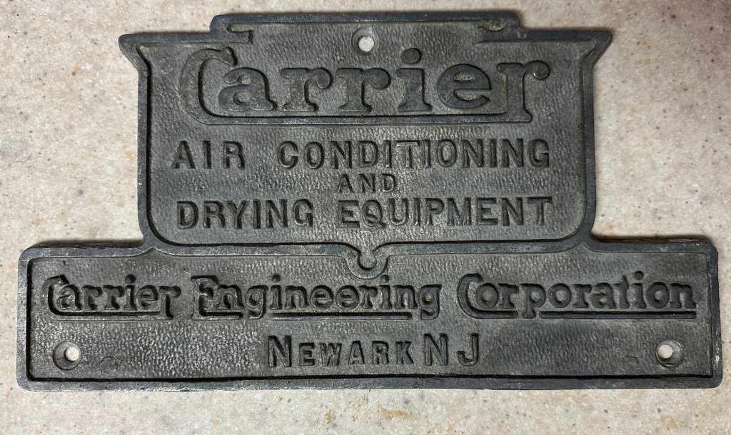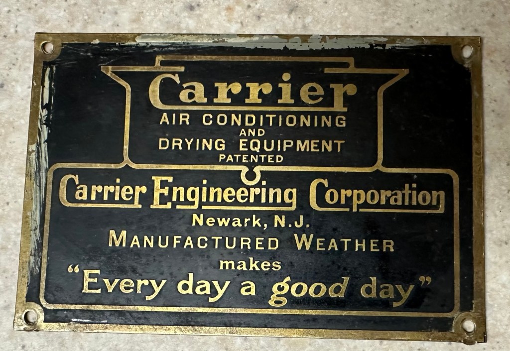 1915 marks the start of our Carrier Badge Tour: We see the first cast of the Carrier Air Conditioning & Drying Equipment logo come to life (fig. A). Through a transition period between his initial startup founding the Carrier Engineering Corporation, they saw immediate success 18 days in American Ammunition Company marking their first contract as well as assisting with the Allied War Effort. After the war, Carrier saw success selling equipment to movie theaters and all throughout USA and the rest of the world. With the first plant being opened up in Newark, New Jersey, the first and rarest style carrier badge shown in (fig. A) shows the Newark manufacture and is something that would have been found on any of their industrial scale refrigeration machines. In 1919, Carried had hired Esten Boiling as their Publicity Engineer to market words that would be later seen in other emblems like (fig. B) such as “Make Every Day a Good Day”, “Manufactured Weather” and “Weathermakers to the World”. That particular badge in (fig. B) would have been featured on numerous chillers throughout the 20’s all originating from the same original Newark plant.